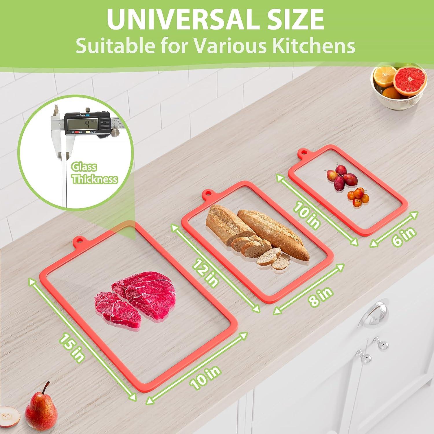 Freshmage 2Pcs Tempered Glass Cutting Boards for Kitchen, Glass Cutting Board Set (10"x6" & 12"x8") with Non-Slip Silicone Edges and Hanging Hole, Clear Cutting Board for Countertop & Everyday Prep(10"x6" 12"x8" 15"x10")